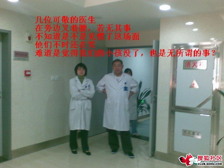大約十分鐘后我又將寶寶抱過去請求醫(yī)生查看告訴他寶寶的腦部已經(jīng)嚴重發(fā)炎,可能惡化了,得到毛曉君醫(yī)生的回答是:你們怎么回事啊,你媽剛來過怎么又來了。白天已經(jīng)掛過水消炎了,而且消炎不是一天能消下去的,等明天管床醫(yī)生來再說。我只能再次把寶寶抱回房間,回到房間的寶寶繼續(xù)無力的呻吟著,我跟我媽還有老婆三人不停的輪流哄抱,最后老婆實在聽不下去了,說心在糾結(jié)在滴血,就走出房間奔到護士臺跟護士講情況,但護士說沒用,要等到白天管床醫(yī)生來才能診斷,這期間老婆有問護士能不能叫醫(yī)生來看看,護士的回答是,值班醫(yī)生晚上一般都是睡覺的,今天都被叫起來幾遍了,很生氣,之后沒多久護士臺來了一對夫婦抱著小孩來看急診的,當時毛曉君醫(yī)生出現(xiàn)了幾分鐘,當他經(jīng)過護士臺時看見幾次去找他的老婆輕瞟一眼又回房間睡了。老婆繼續(xù)問護士能不能叫內(nèi)科的醫(yī)生來看一下,護士說內(nèi)科的醫(yī)生也是值班的,他更不會理會我們。老婆只能待在護士臺旁的凳子上等待醫(yī)生或護士憐憫之心,幾個小時的焦急等待也沒有得到他們的同情。