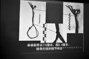 通報(bào)方:自縊工具為死者所穿鞋上的鞋帶,死者穿一雙黑色高幫旅游鞋,鞋帶呈柱狀,每根長172厘米,直徑0.4厘米。