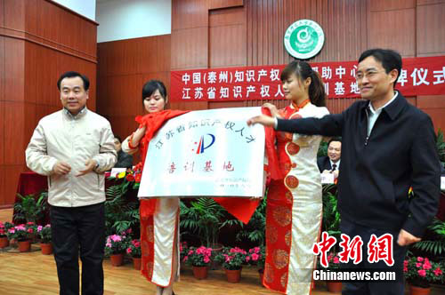 國家知識產(chǎn)權(quán)局副局長甘紹寧和泰州代市長徐郭平為中國(泰州)知識產(chǎn)權(quán)維權(quán)援助中心揭牌。胡家棟 攝